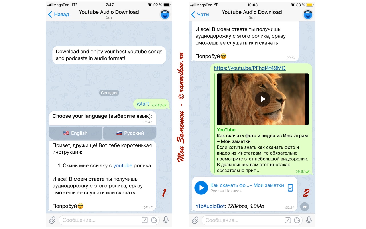Теперь после выбора языка их два, вы можете направлять боту абсолютно любую ссылку на видеоролик. Отправили и через мгновение заполучили аудиофайл, который можно загрузить на свой гаджет (смартфон, планшет) или компьютер.